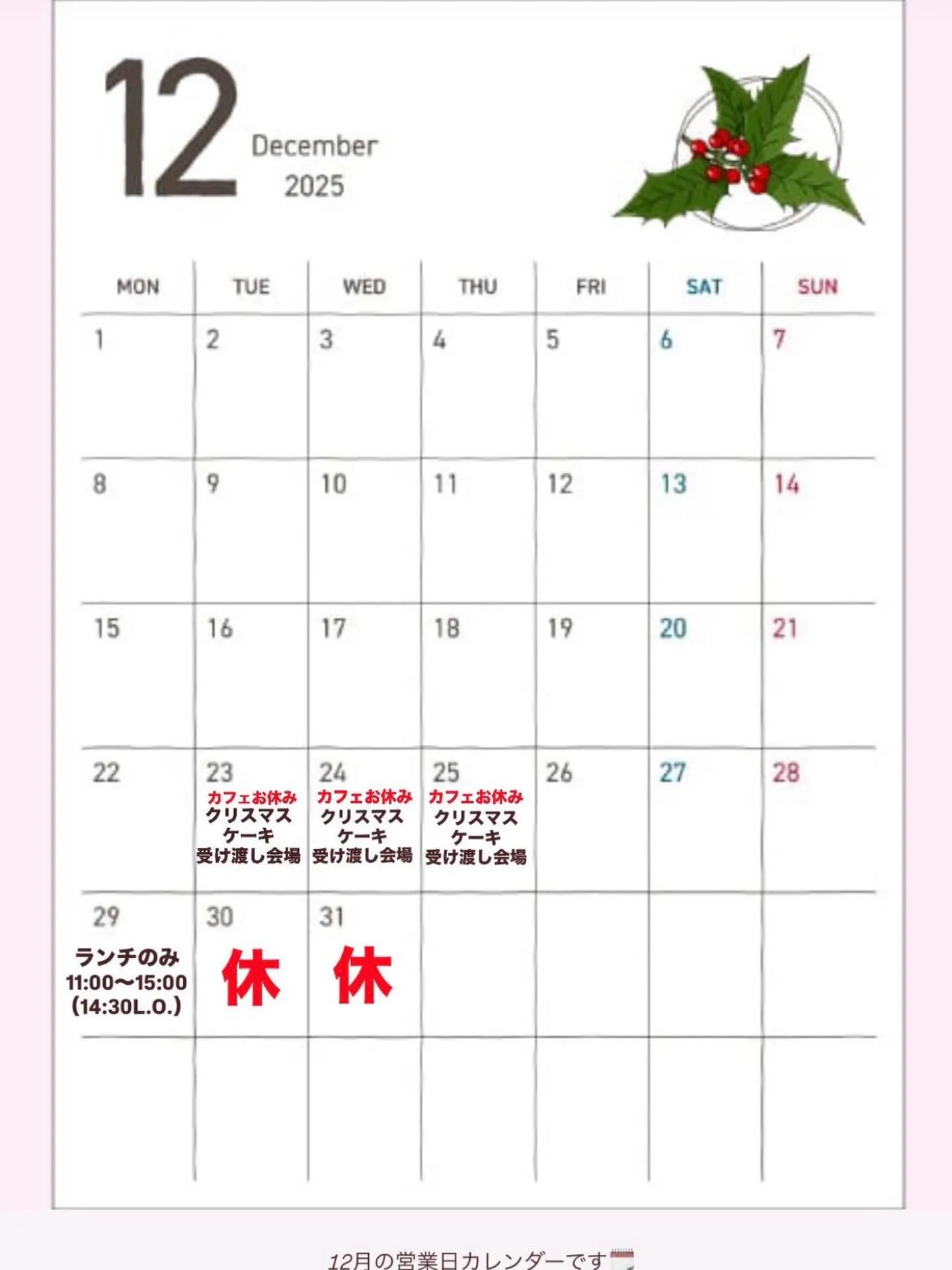 クリスマス期間 23~25日はクリスマスケーキをカフェでお渡し致します。